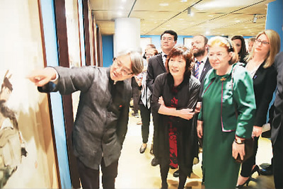 北京畫院副院長、北京畫院美術(shù)館館長吳洪亮向中國駐希臘大使章啟月、希臘文化和體育部部長莉娜·佐尼女士介紹齊白石的畫作