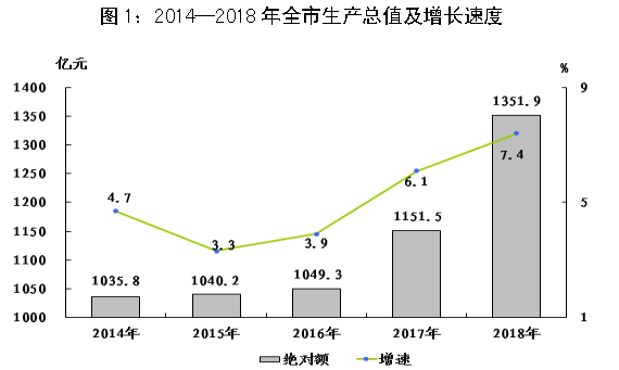 初步核算,全年全市生產(chǎn)總值1351.9億元,按可比價(jià)格計(jì)算,比上年增長7.4%。其中,第一產(chǎn)業(yè)增加值49.2億元,增長0.3%,占生產(chǎn)總值的比重為3.6%;第二產(chǎn)業(yè)增加值717.9億元,增長7.2%,占生產(chǎn)總值的比重為53.1%;第三產(chǎn)業(yè)增加值584.8億元,增長8.5%,占生產(chǎn)總值的比重為43.3%。第三產(chǎn)業(yè)中,金融保險(xiǎn)業(yè)增加值86.8億元,增長8.0%;交通運(yùn)輸、倉儲(chǔ)和郵政業(yè)增加值100.9億元,增長5.9%;批發(fā)和零售業(yè)增加值68.2億元,增長3.2%;住宿和餐飲業(yè)增加值37.5億元,增長6.7%;營利性服務(wù)業(yè)增加值82.6億元,增長23.8%。人均地區(qū)生產(chǎn)總值57819元,按2018年平均匯率計(jì)算為8737美元。