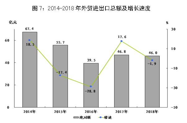 全年全市海關(guān)進(jìn)出口總額46.0億元,下降1.9%。其中,進(jìn)口額33.4億元,下降2.7%;出口額12.6億元,增長0.2%。