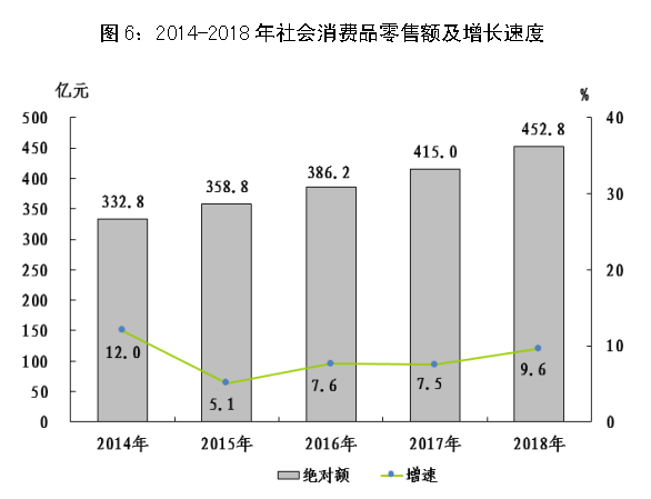 全年全市社會(huì)消費(fèi)品零售總額452.8億元,增長9.6%。按經(jīng)營地統(tǒng)計(jì),城鎮(zhèn)消費(fèi)品零售額383.9億元,增長9.1%;鄉(xiāng)村消費(fèi)品零售額68.9億元,增長12.4%。