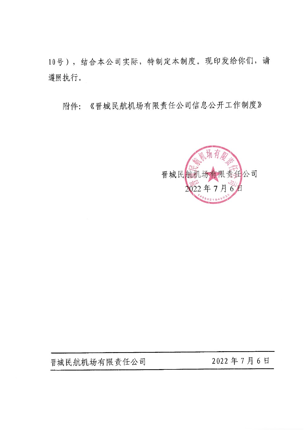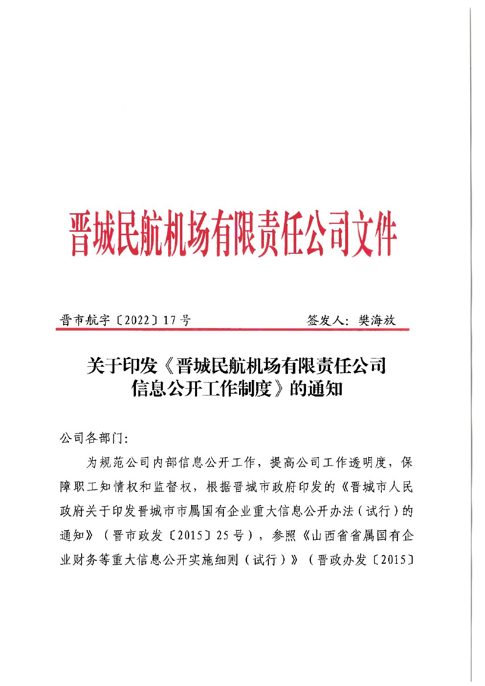 關(guān)于印發(fā)《晉城民航機(jī)場有限責(zé)任公司信息公開工作制度》的通知